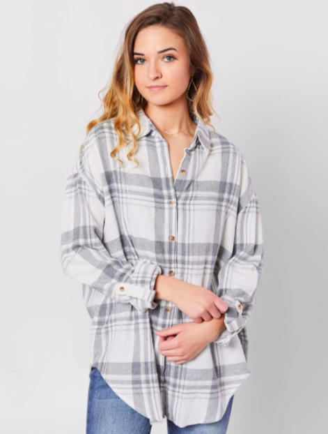 Every girl needs at least one plaid flannel in her wardrobe for the season, because, otherwise, is it really fall without one? And while the trendy colors for fall flannels are typically colors like red, black, navy blue, and burnt orange, I love lighter, more neutral shades like this flannel in white and grey to brighten up the look, while still staying trendy. This flannel is part of Buckle’s SoSoft collection, which means it is made of comfortable, lightweight, everyday fabric. Its longer length in the front and back also makes it modest and easy to wear with more fitted jeans, while its cut makes it easy to tuck in or tie in the front with a cardigan on top for an alternative look. Shop it, here. You can also find a similar flannel in more sizes, here.
