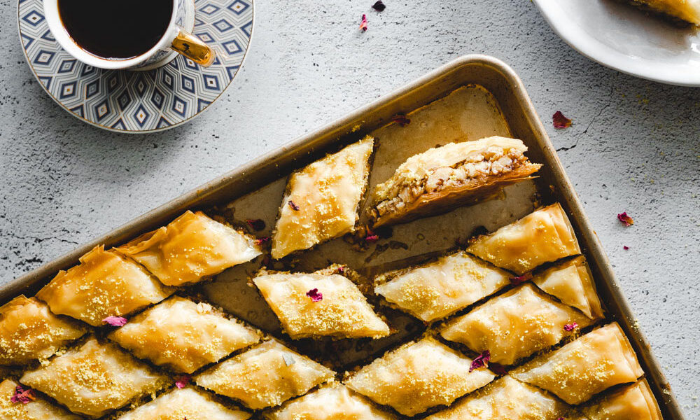 You have crunchy phyllo dough layers sandwiching the most delicious cardamom-flavored nut mixture, all doused in simple syrup. Some make it with walnut, some with pistachios, and others flavor it with rosewater. No matter which variation you try – you’re going to fall in love.