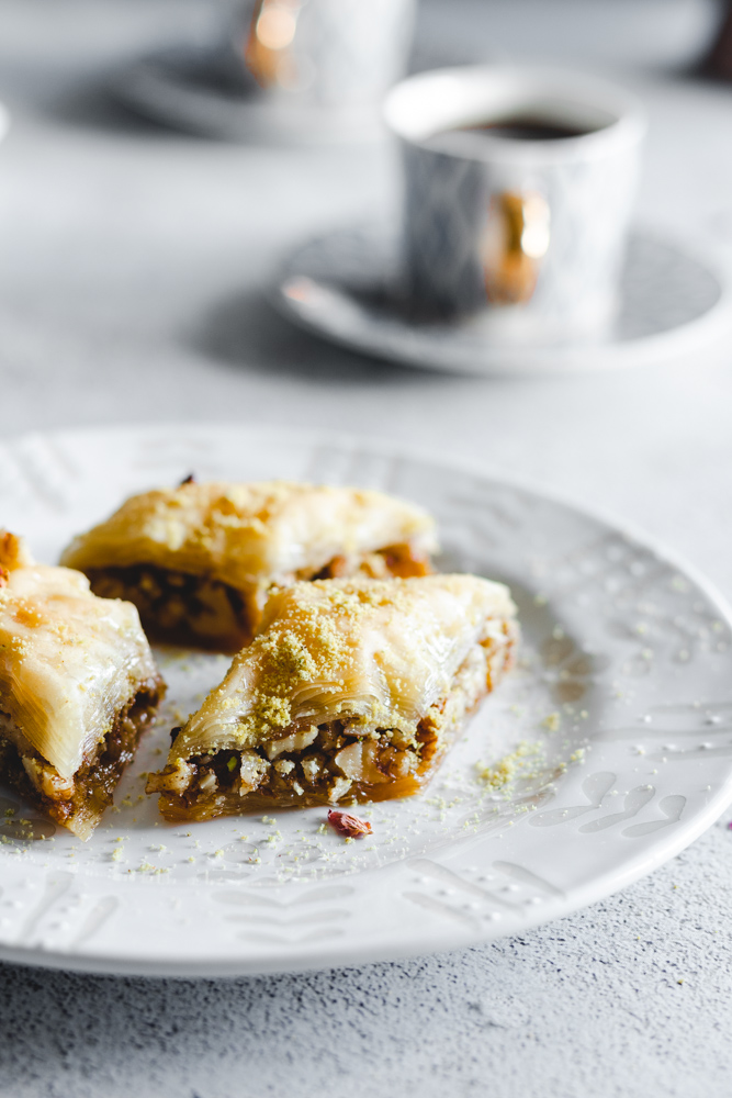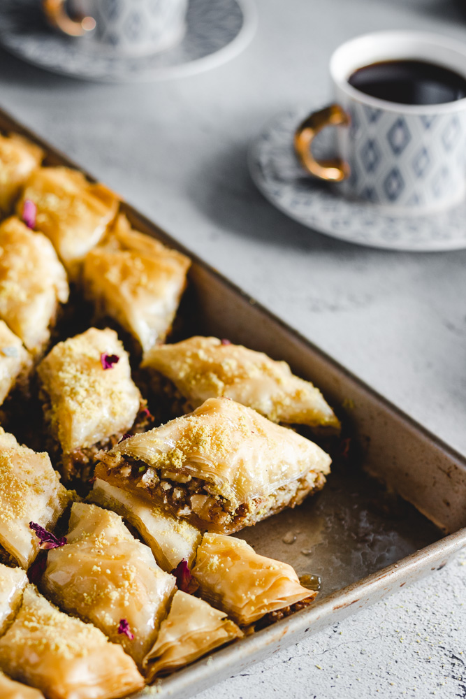 You have crunchy phyllo dough layers sandwiching the most delicious cardamom-flavored nut mixture, all doused in simple syrup. Some make it with walnut, some with pistachios, and others flavor it with rosewater. No matter which variation you try – you’re going to fall in love.