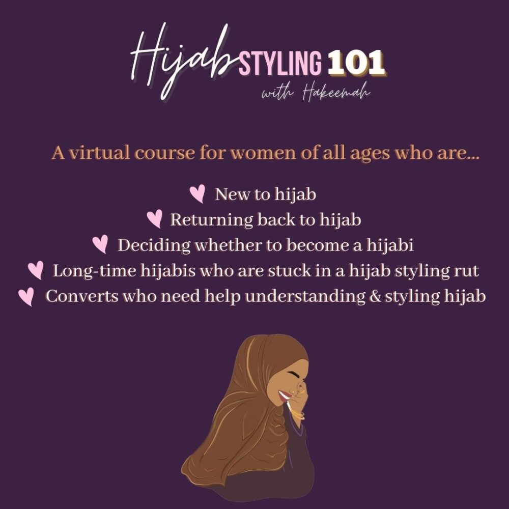 If you are interested in wearing the hijab, struggling with the idea, or are currently wearing it, and are experiencing some challenges or doubts, then this is the course for you! Hijab Styling 101 is uniting and guiding Muslimahs in their hijab journeys so that they don’t feel as alone, confused, or frustrated. In addition to becoming part of a supportive community of women, you also gain exclusive access to Hakeemah’s tried-and-true hijab styling tips and tricks!