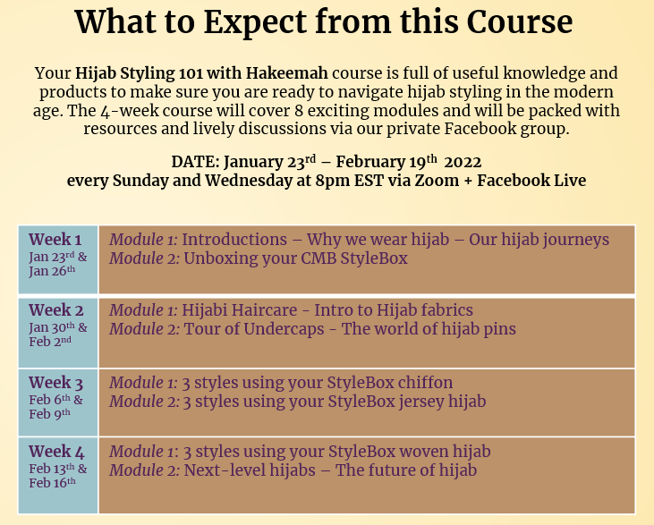 The class will be super engaging, filled with fun, lively discussions and will integrate tons of resources. We’ll touch on everything from the religious basis of hijab, to various fabrics, accessories, and undercaps, all in hopes that each student exits the course with a greater understanding, love, and appreciation for hijab.