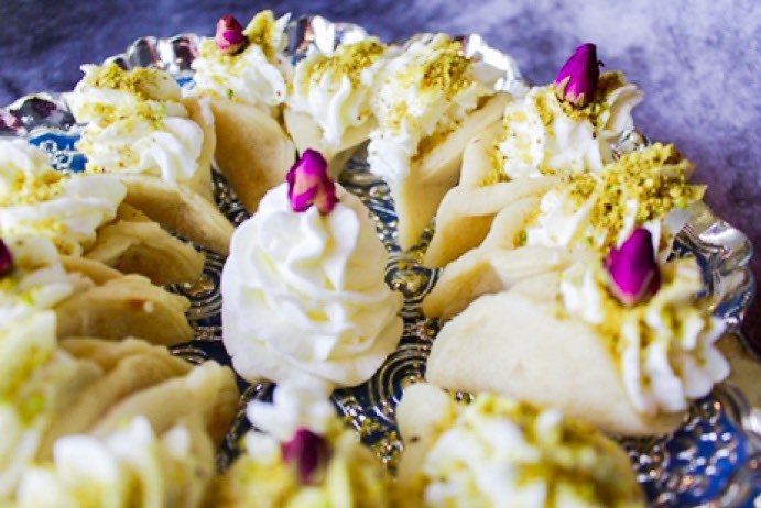 One of the chefs decided to invent a small pancake-like dough, stuffed with nuts or cream (ishta in Arabic), then placed it neatly in a dish and decorated it with nuts. He presented his invention to the guests in the royal palace on a beautiful tray. After a bite, the guests kept rushing to him and picking out more from the tray. The baker named it “qatayef,” accordingly, and it has been popular ever since!